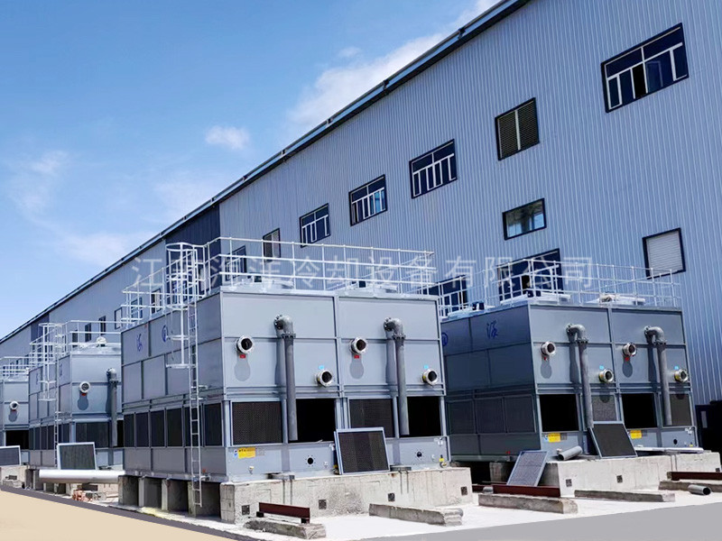 The working fluid (water or other liquid) is circulated in the coil of the closed cooling tower, and the heat of the working fluid is dispersed into the spray water flowing through the coil. At the same time, the air around the outside of the unit enters from the air inlet grille and flows upward through the coil in the opposite direction of the spray water flow. A small amount of water evaporates and carries away heat. The hot and humid air is discharged into the surrounding atmosphere by the v